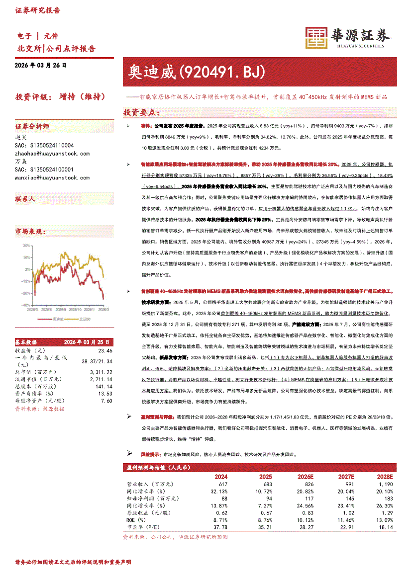 奥迪威:华源证券-奥迪威-920491-智能家居协作机器人订单增长+智驾标装率提升,首创覆盖40~450kHz发射频率的MEMS新品-260326