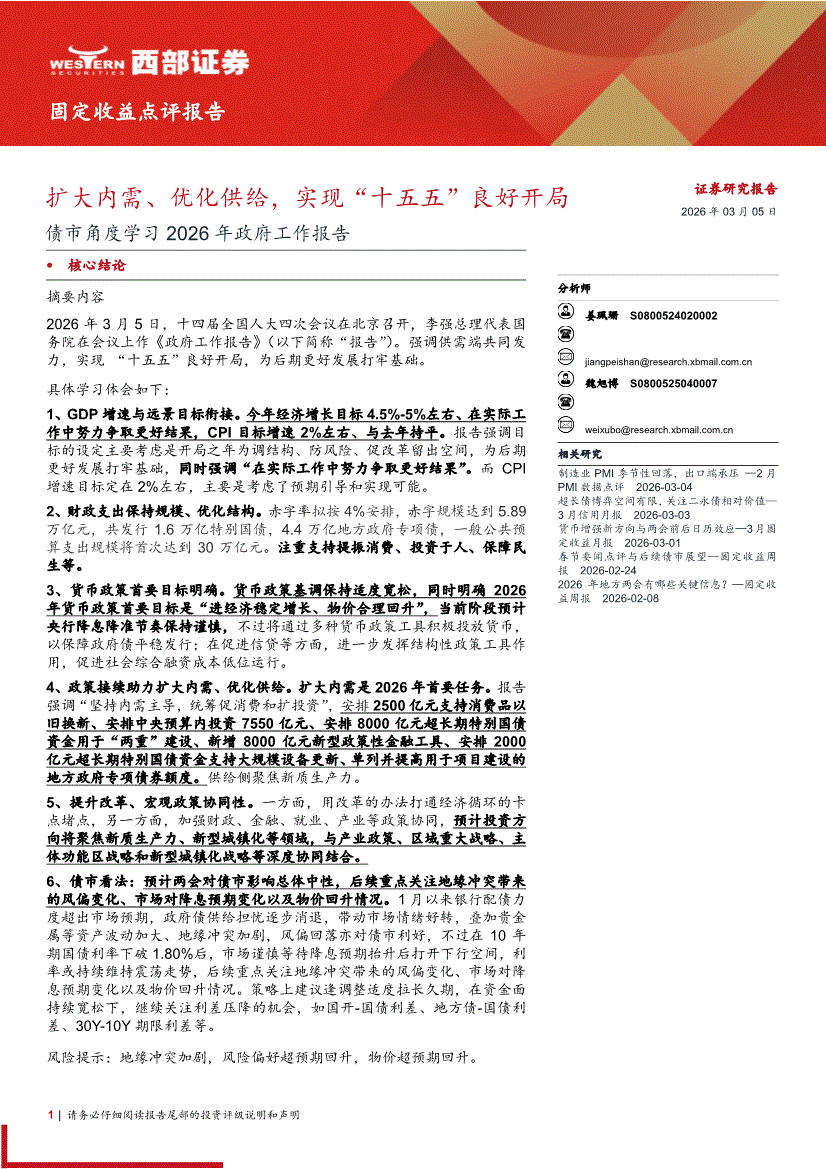 西部证券-债市角度学习2026年政府工作报告:扩大内需、优化供给,实现“十五五”良好开局-260305