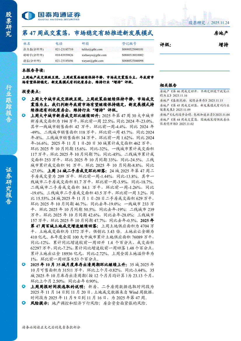 房地产行业:国泰海通证券-房地产行业:第47周成交震荡,市场稳定有助推进新发展模式-251124