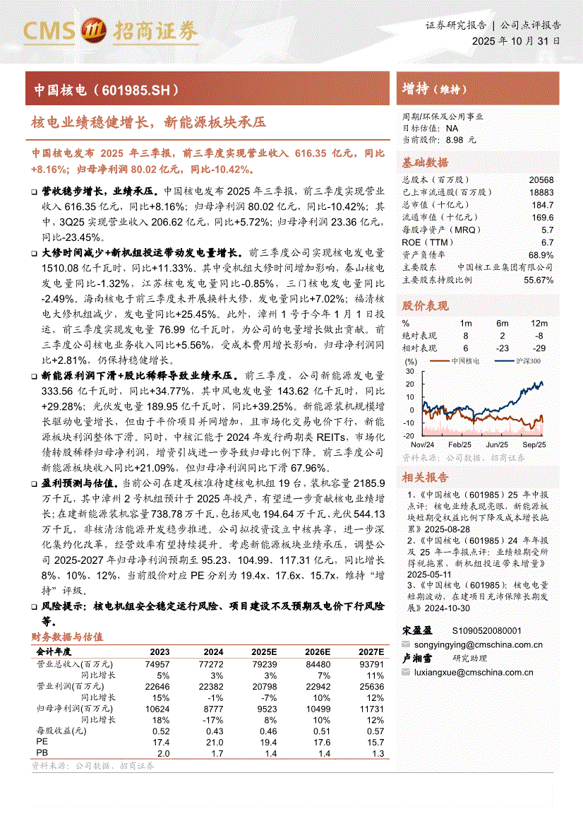 中国核电:招商证券-中国核电-601985-核电业绩稳健增长,新能源板块承压-251031