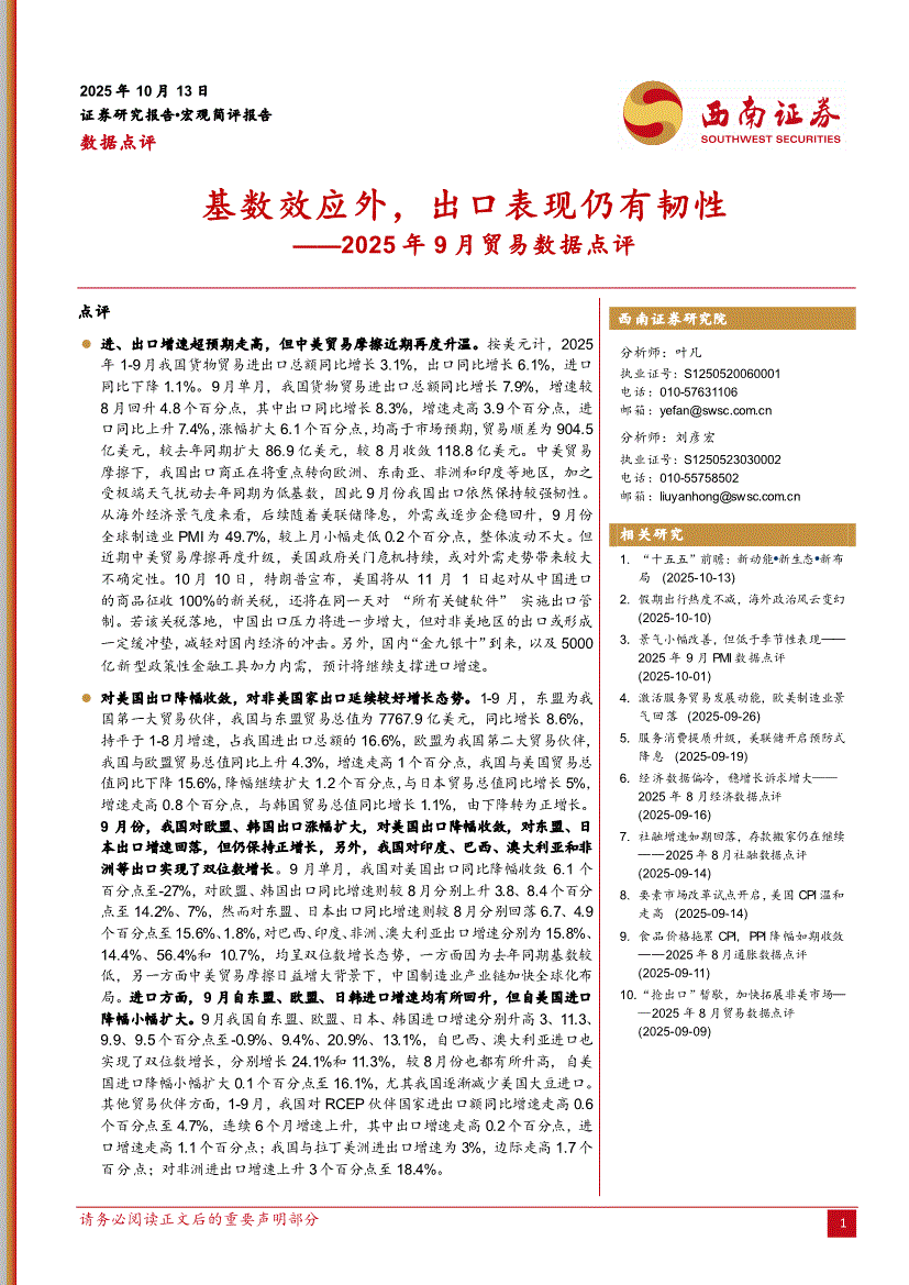 西南证券-2025年9月贸易数据点评:基数效应外,出口表现仍有韧性-251013