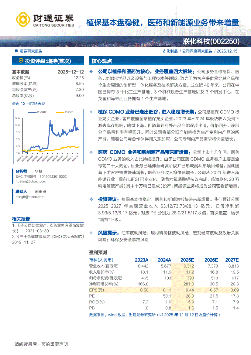 财通证券-联化科技-002250-植保基本盘稳健,医药和新能源业务带来增量-251215