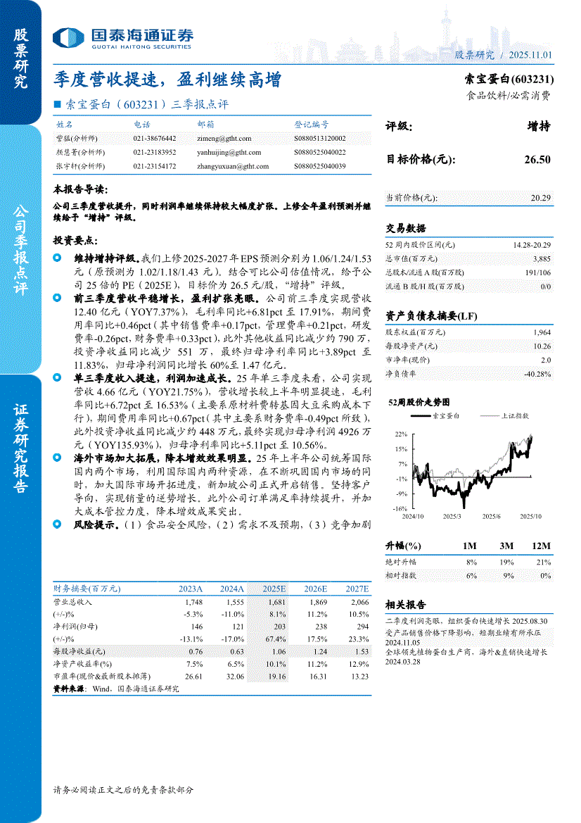索宝蛋白:国泰海通证券-索宝蛋白-603231-三季报点评:季度营收提速,盈利继续高增-251101