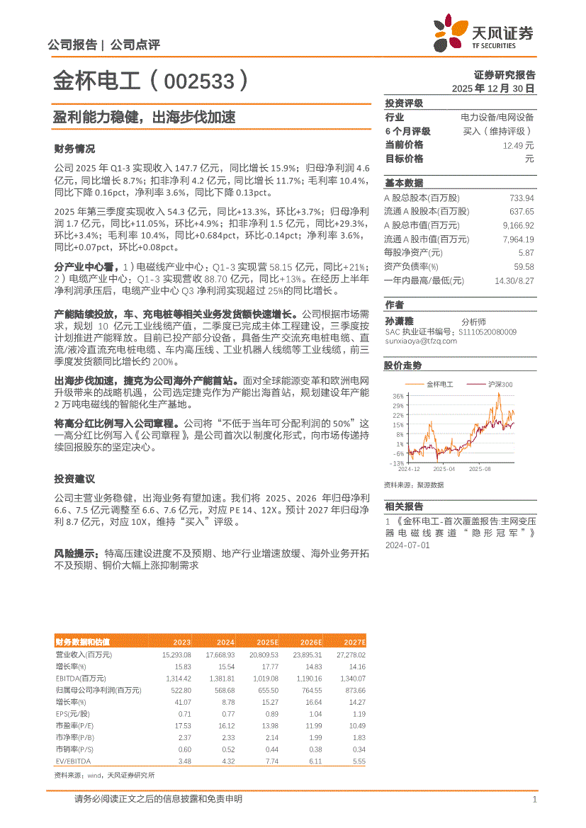 金杯电工:天风证券-金杯电工-002533-盈利能力稳健,出海步伐加速-251230