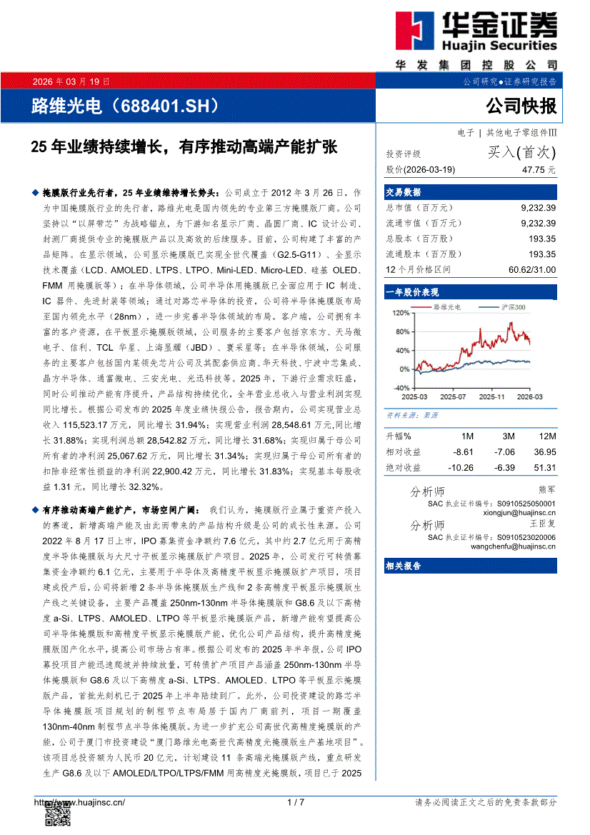 路维光电:华金证券-路维光电-688401-25年业绩持续增长,有序推动高端产能扩张-260319