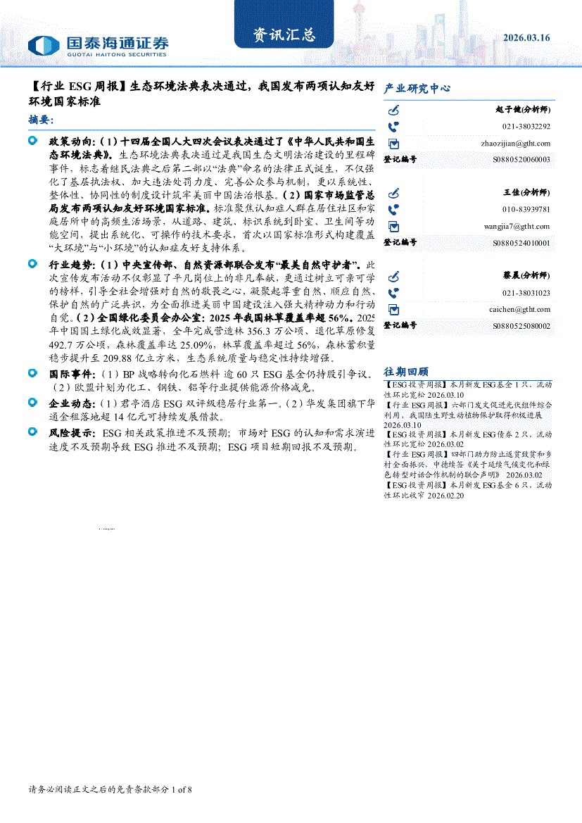国泰海通证券-资讯汇总:【行业ESG周报】生态环境法典表决通过,我国发布两项认知友好环境国家标准-260316