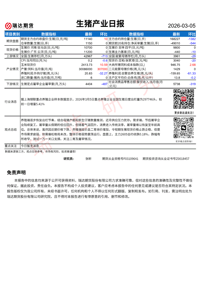 瑞达期货-生猪市场周报:市场供应充足,生猪偏弱震荡-260313