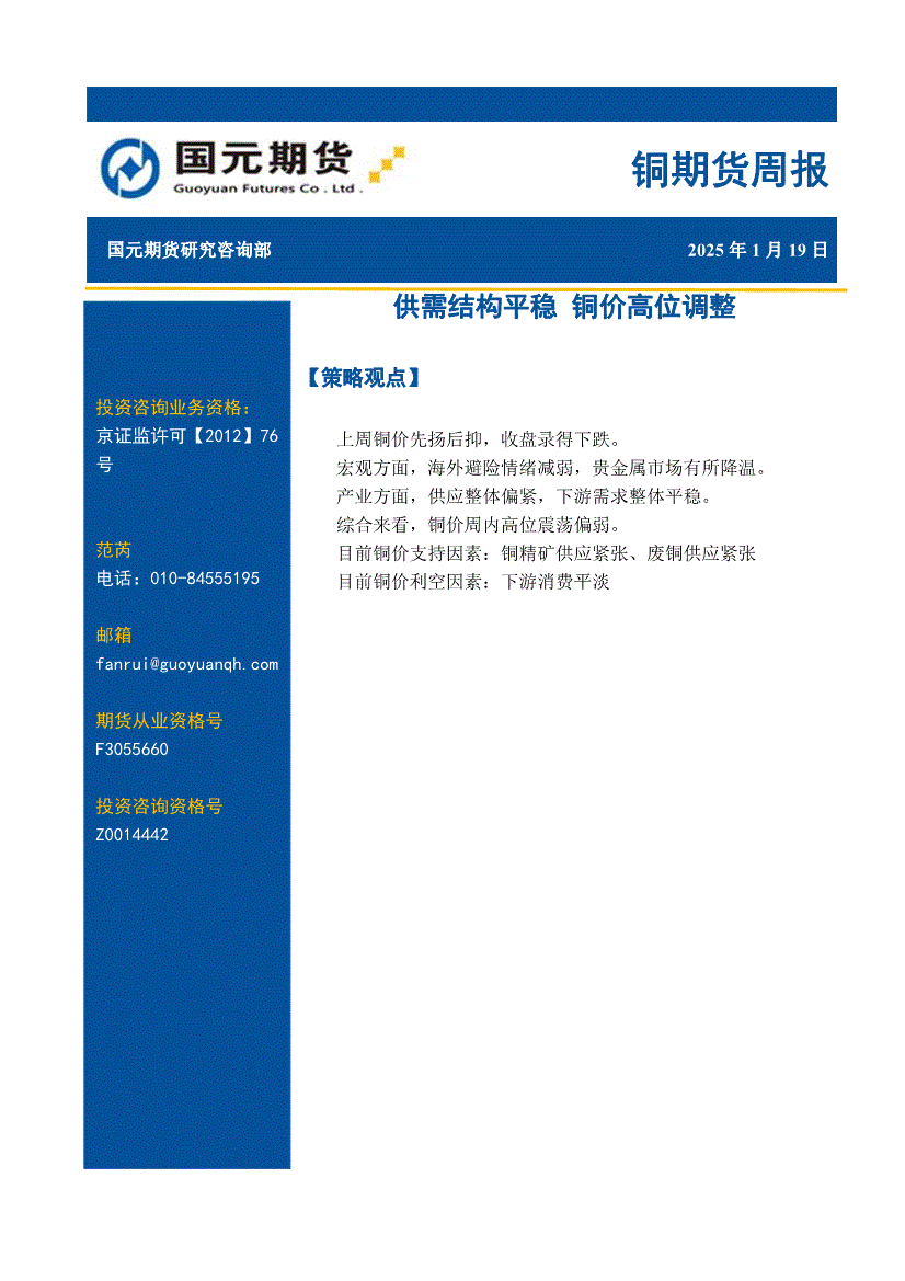 国元期货-铜期货周报:供需结构平稳,铜价高位调整-260119