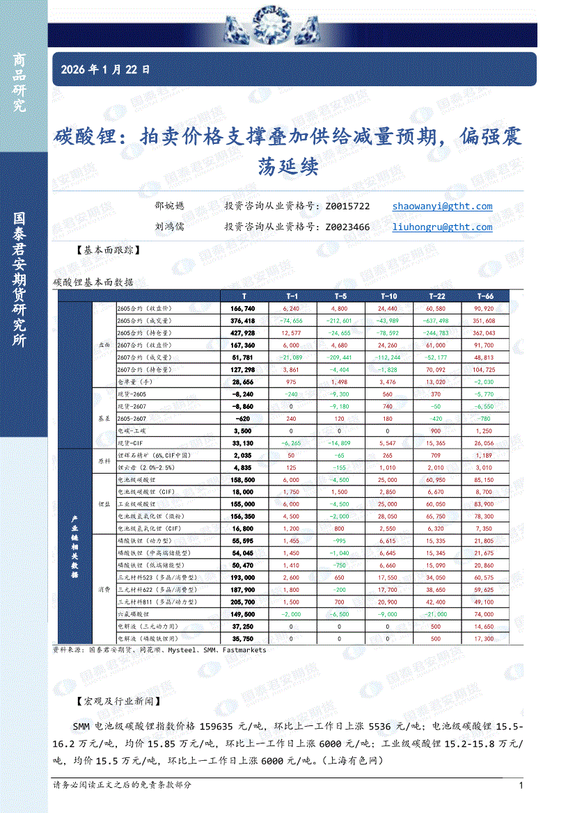 国泰君安期货-碳酸锂:拍卖价格支撑叠加供给减量预期,偏强震荡延续-260122