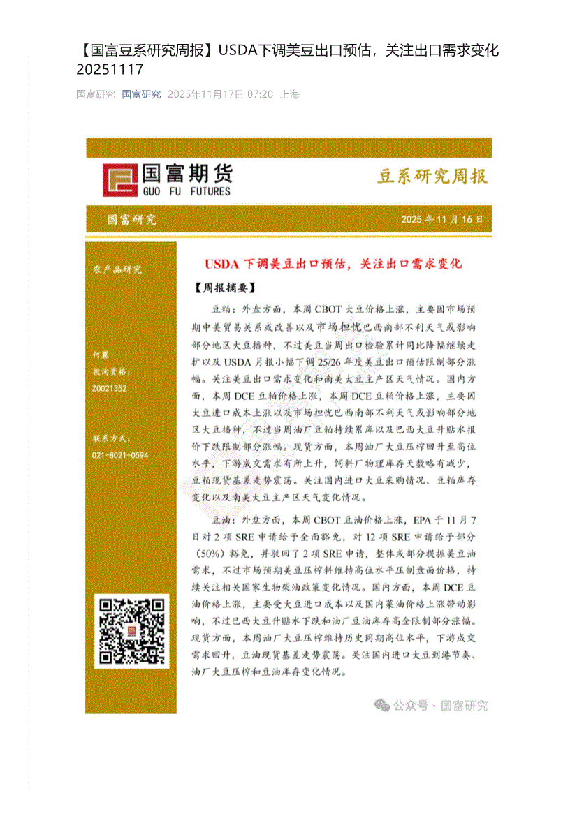 国富期货-豆系研究周报:USDA下调美豆出口预估,关注出口需求变化-251116