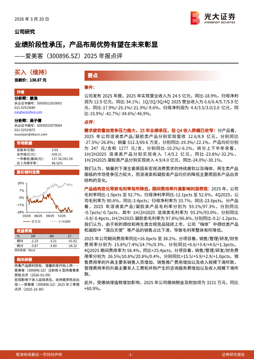 爱美客:光大证券-爱美客-300896-2025年报点评:业绩阶段性承压,产品布局优势有望在未来彰显-260320
