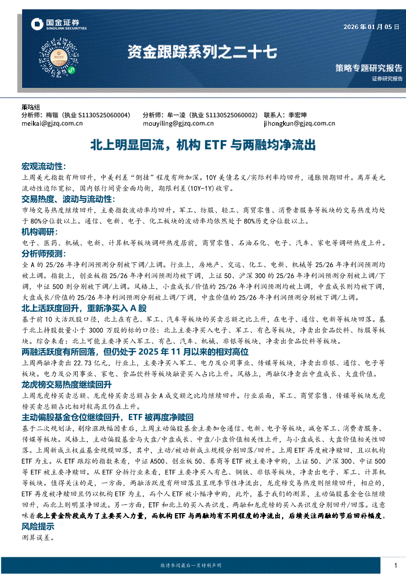国金证券-资金跟踪系列之二十七:北上明显回流,机构ETF与两融均净流出-260105