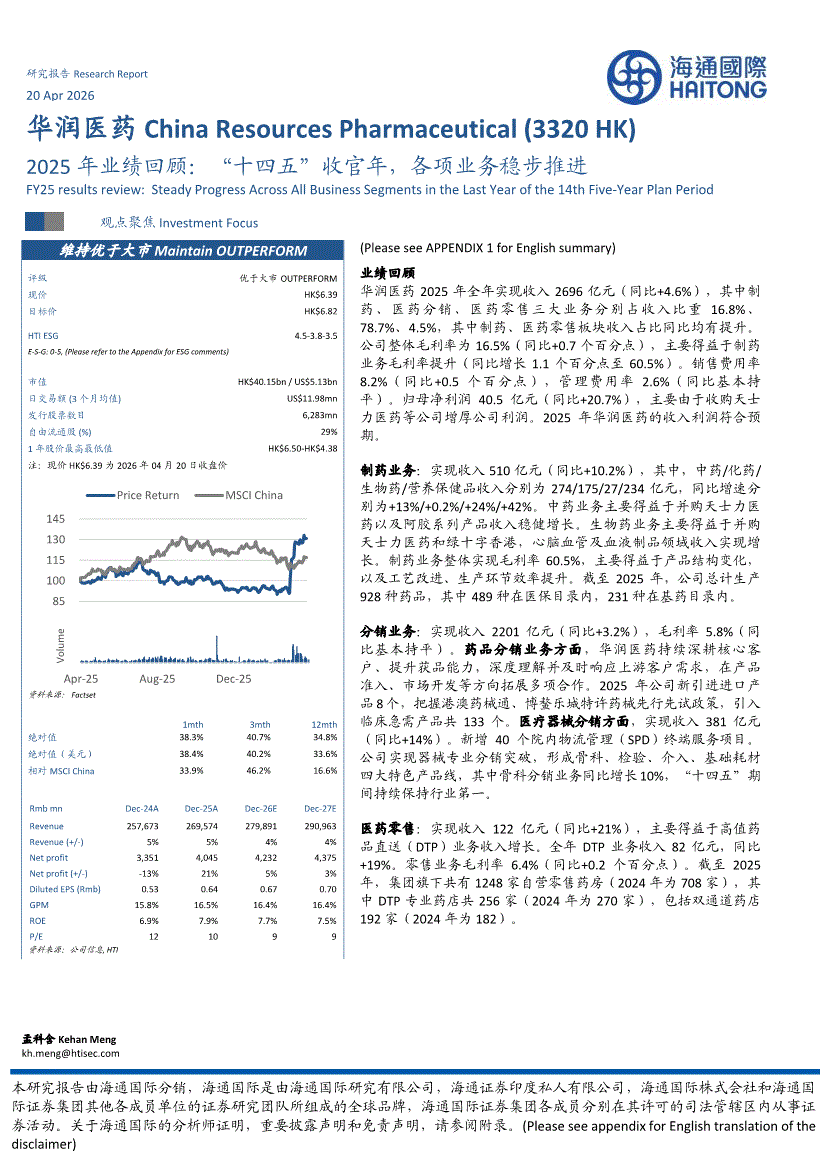 华润医药:海通国际-华润医药-3320.HK-2025年业绩回顾:“十四五”收官年,各项业务稳步推进-260420