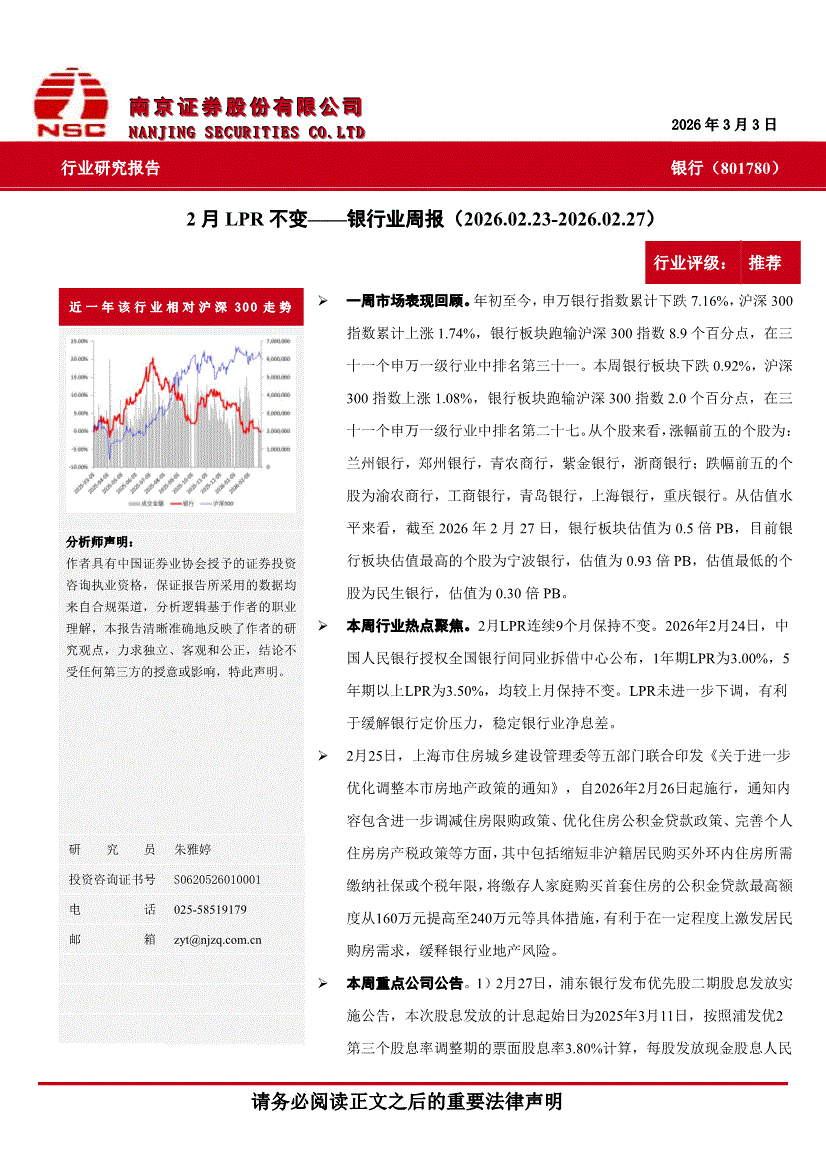 银行业:南京证券-银行业周报:2月LPR不变-260303