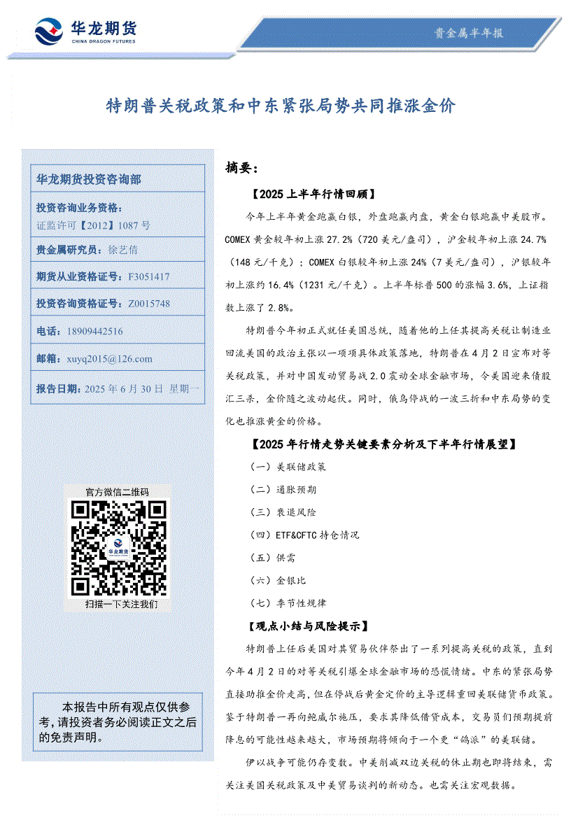 华龙期货-贵金属半年报:特朗普关税政策和中东紧张局势共同推涨金价-250630
