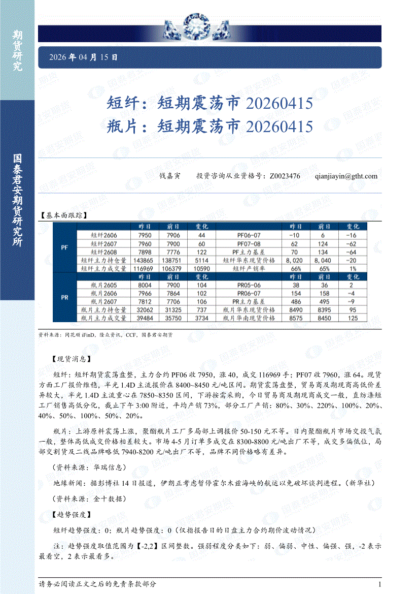 国泰君安期货-短纤:短期震荡,瓶片,短期震荡市-260415