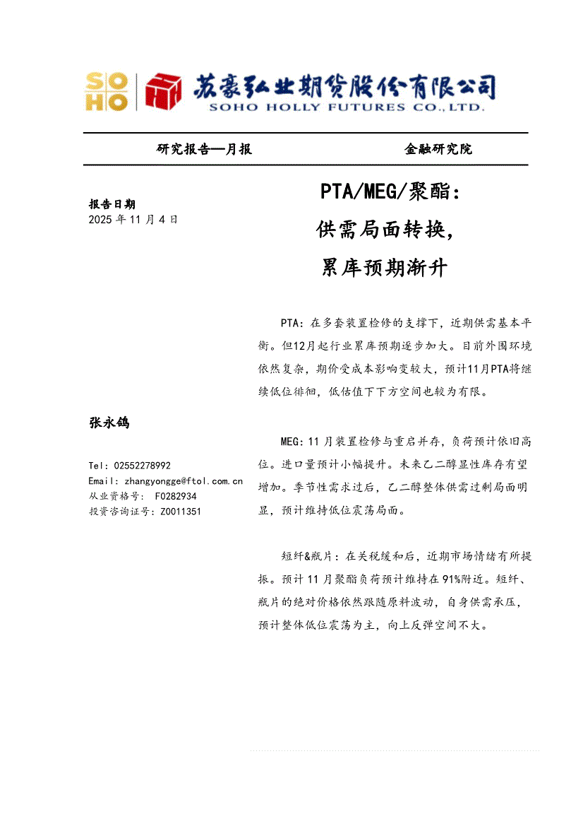 弘业期货-PTA/MEG/聚酯:供需局面转换,累库预期渐升-251104