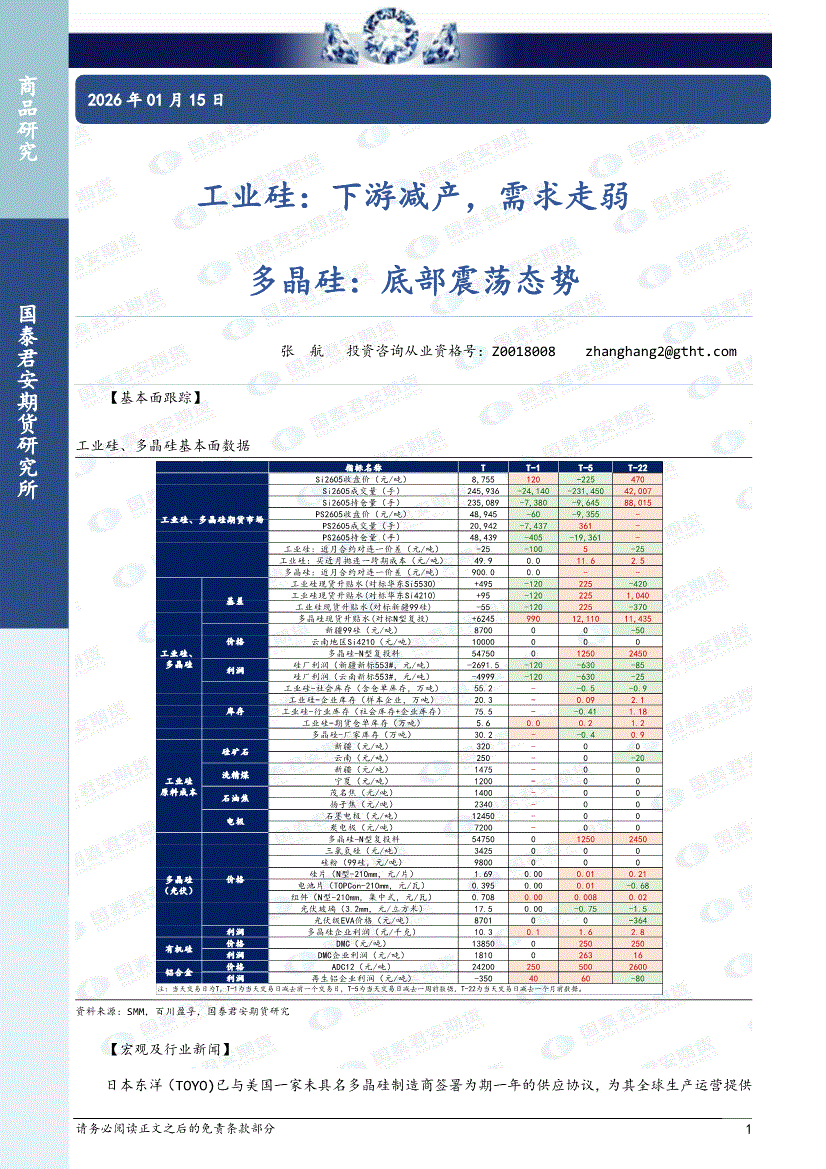 国泰君安期货-工业硅:下游减产,需求边际递减,多晶硅,关注工厂报价情况-260114