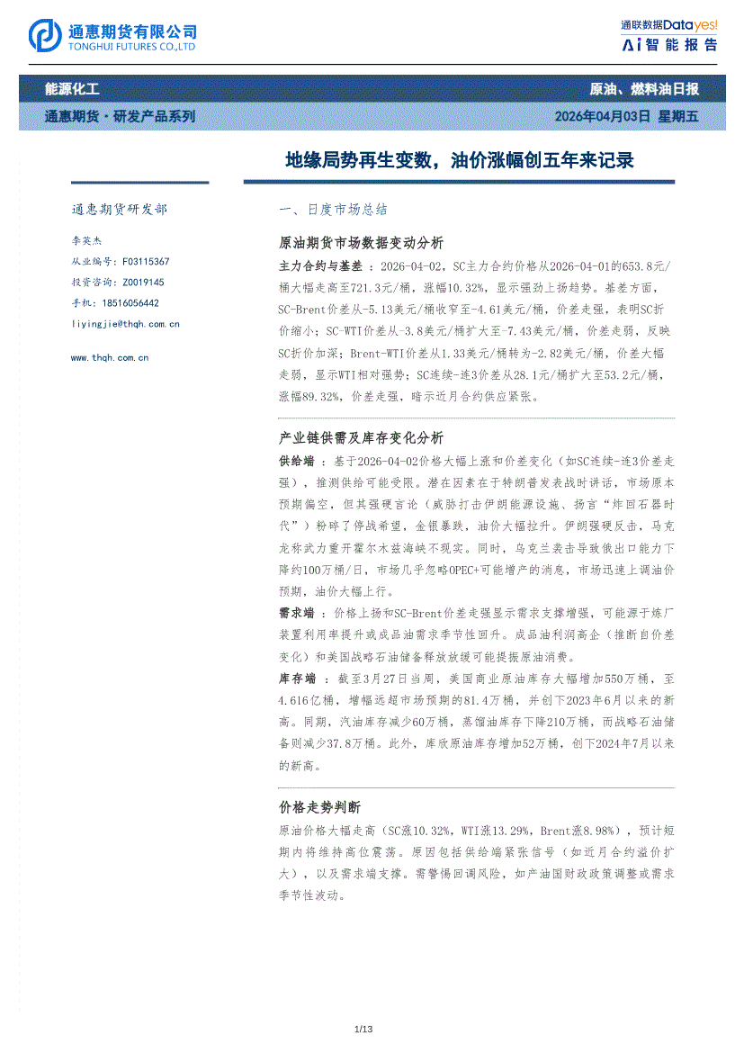 通惠期货-原油、燃料油日报:地缘局势再生变数,油价涨幅创五年来记录-260403