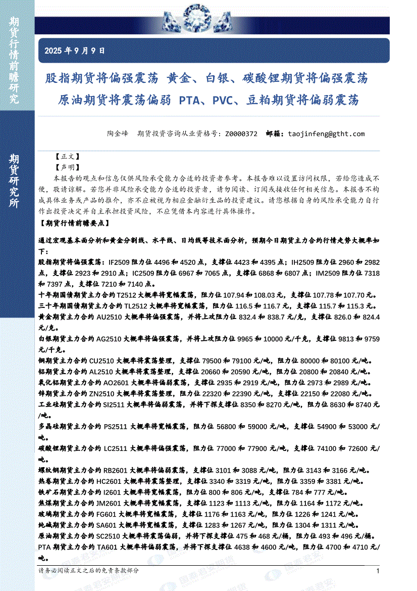 国泰君安期货-股指期货将偏强震荡,黄金、白银、碳酸锂期货将偏强震荡,原油期货将震荡偏弱,PTA、PVC、豆粕期货将偏弱震荡-250909