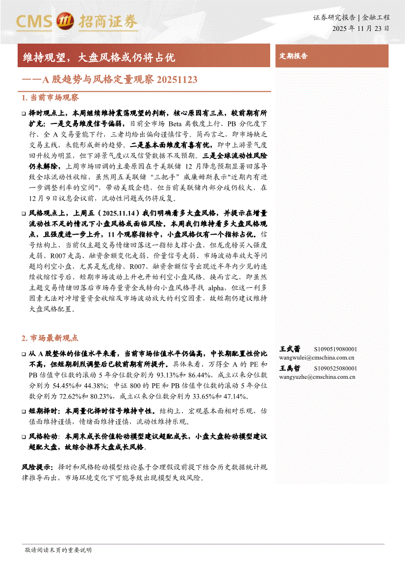 招商证券-A股趋势与风格定量观察:维持观望,大盘风格或仍将占优-251123