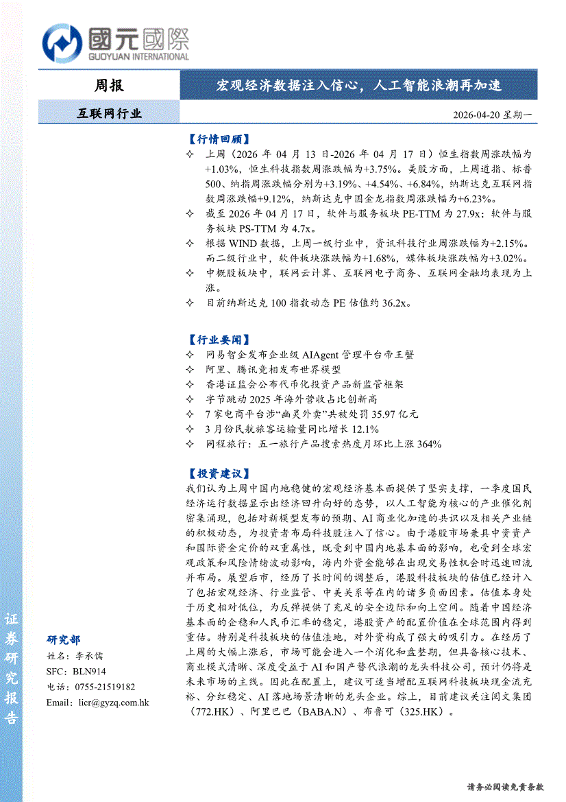 互联网行业:国元国际-互联网行业周报:宏观经济数据注入信心,人工智能浪潮再加速-260420