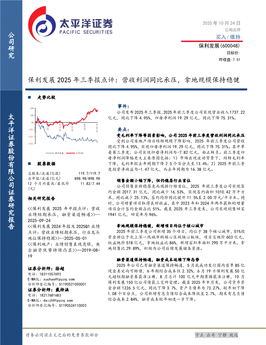 保利发展:太平洋证券-保利发展-600048-2025年三季报点评:营收利润同比承压,拿地规模保持稳健-251024