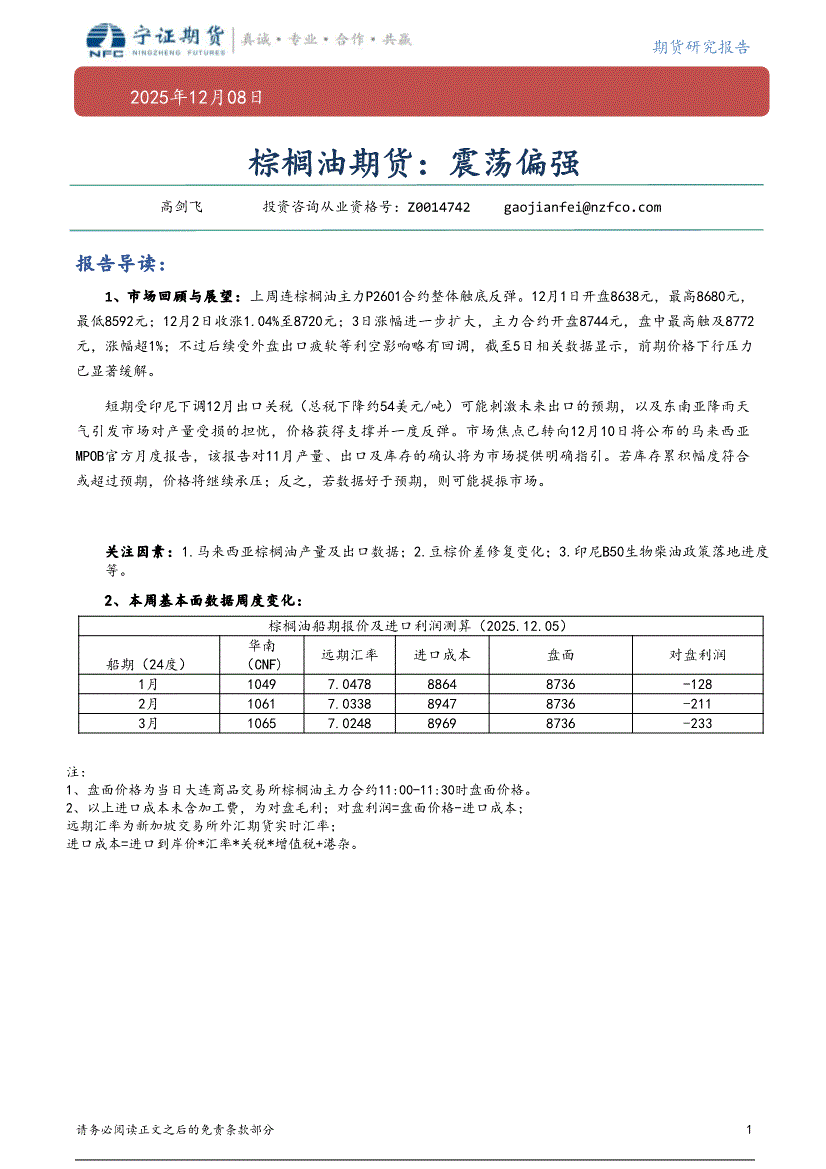 宁证期货-棕榈油期货:震荡偏弱-251215