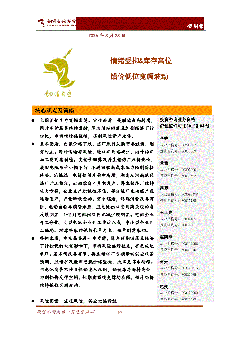 铜冠金源期货-铅周报:情绪受抑&库存高位,铅价低位宽幅波动-260323