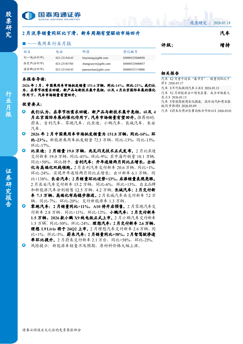 乘用车行业:国泰海通证券-乘用车行业月报:2月淡季销量同环比下滑,新车周期有望驱动市场回升-260318