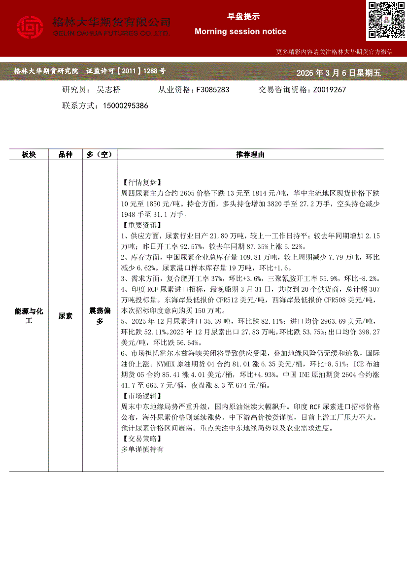 格林大华期货-早盘提示:尿素-260305