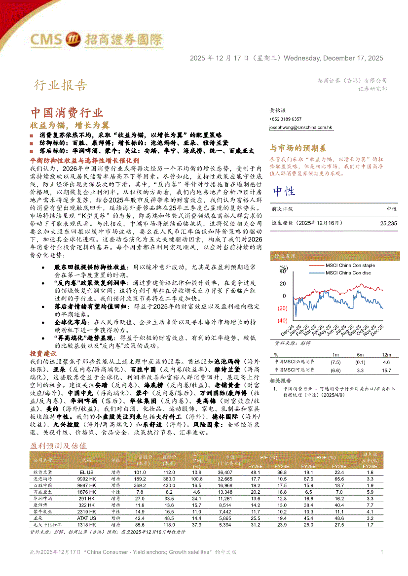 消费行业:招商证券(香港)-中国消费行业:收益为锚,增长为翼-251217