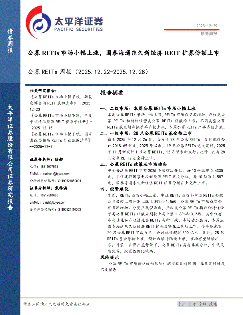 太平洋证券-公募REITs周报:公募REITs市场小幅上涨,国泰海通东久新经济REIT扩募份额上市-251229