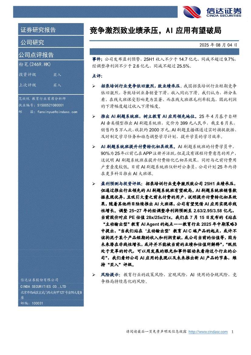 粉笔:信达证券-粉笔-2469.HK-竞争激烈致业绩承压,AI应用有望破局-250804