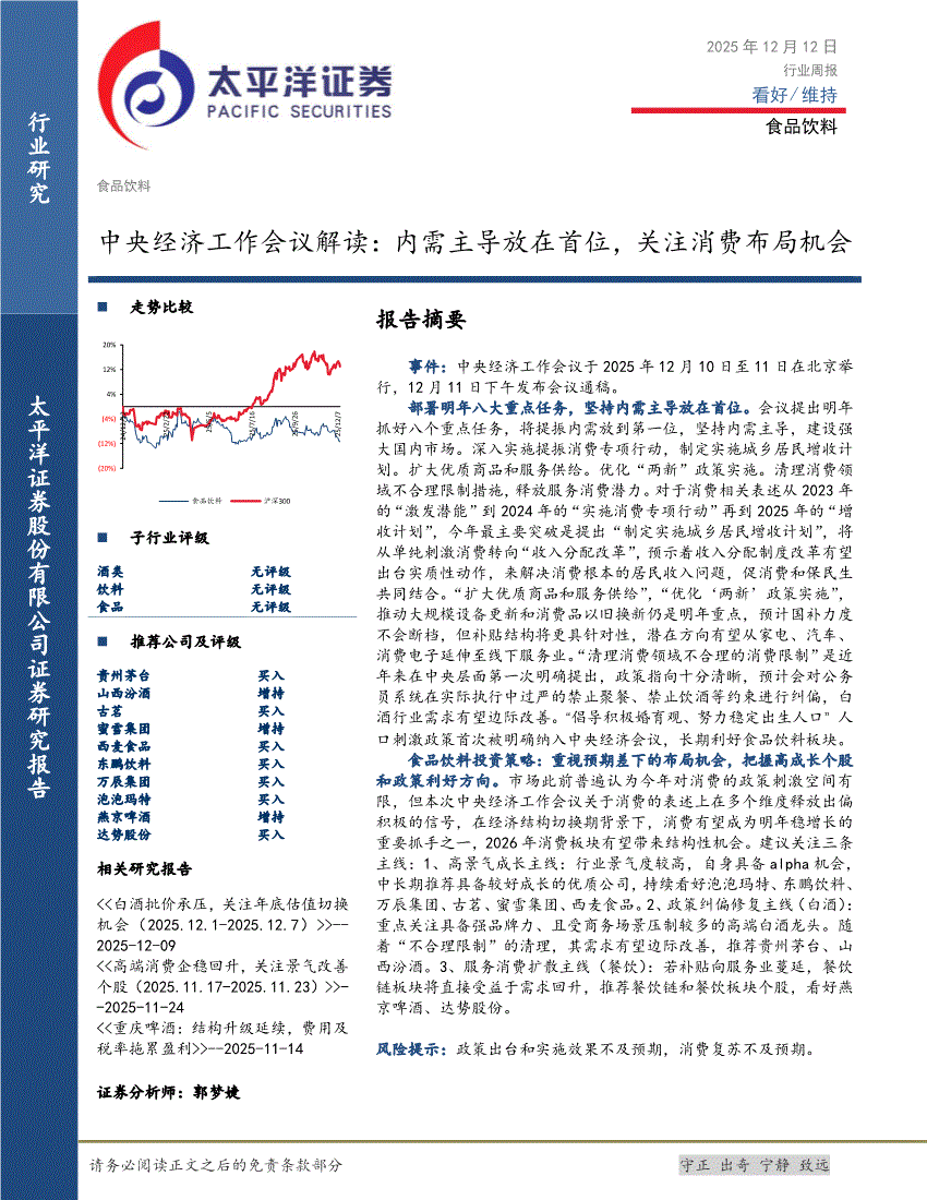食品饮料行业:太平洋证券-食品饮料行业周报:中央经济工作会议解读,内需主导放在首位,关注消费布局机会-251212