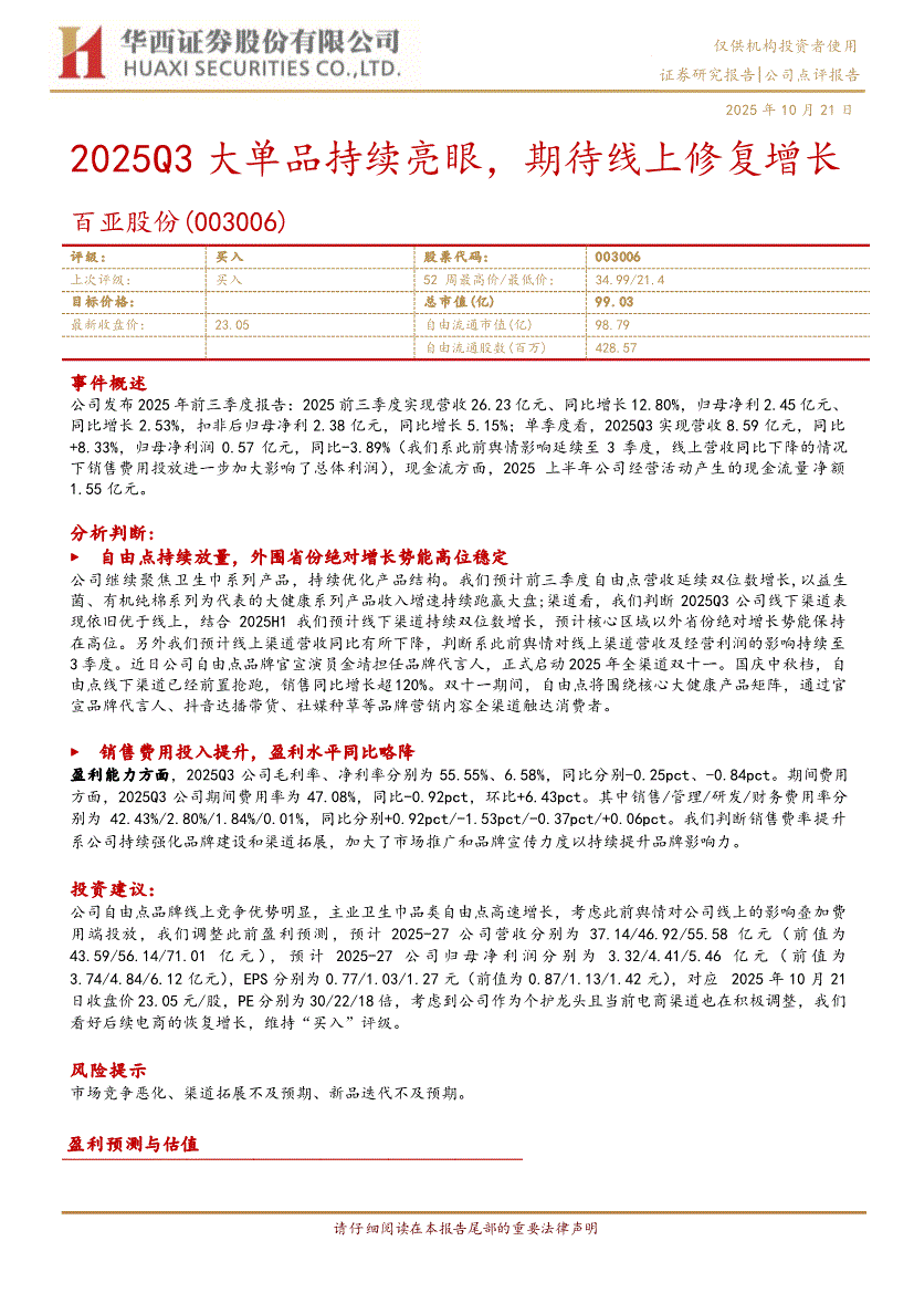 百亚股份:华西证券-百亚股份-003006-2025Q3大单品持续亮眼,期待线上修复增长-251021