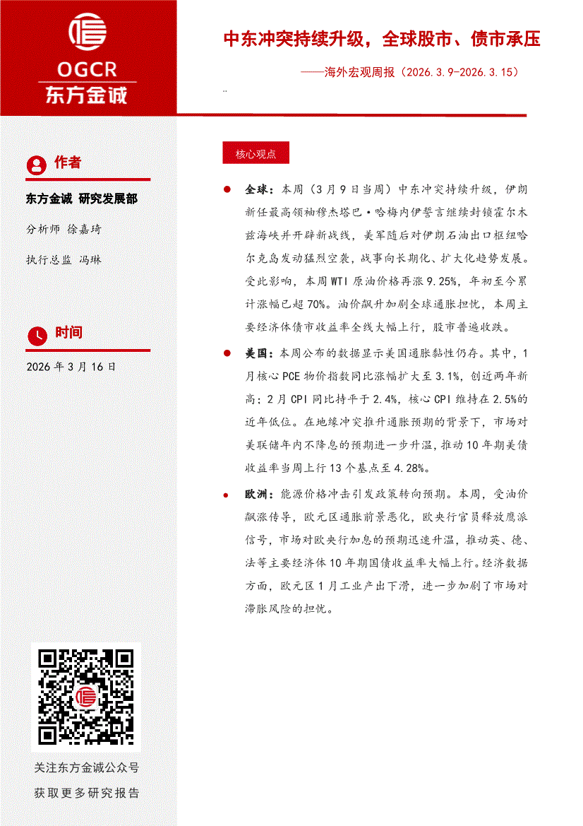 东方金诚-海外宏观周报:中东冲突持续升级,全球股市、债市承压-260316