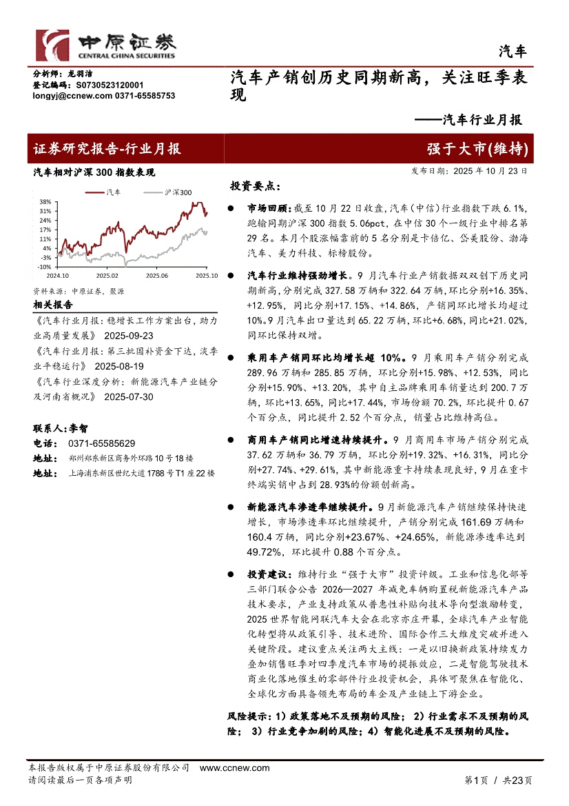 汽车行业:中原证券-汽车行业月报:汽车产销创历史同期新高,关注旺季表现-251023