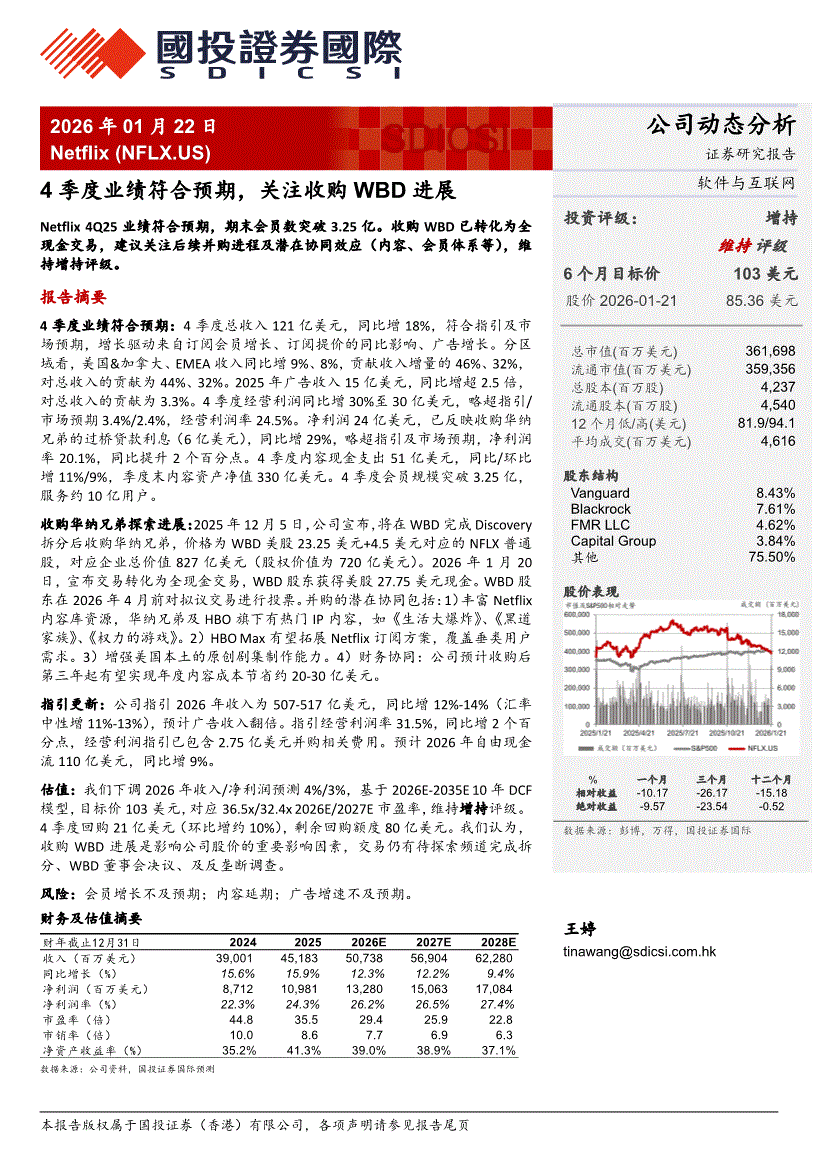 Netflix:国投证券国际-Netflix-NFLX.US-4季度业绩符合预期,关注收购WBD进展-260122