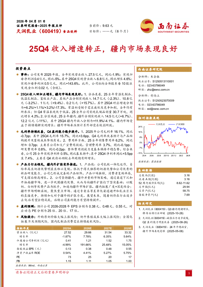 天润乳业:西南证券-天润乳业-600419-25Q4收入增速转正,疆内市场表现良好-260401