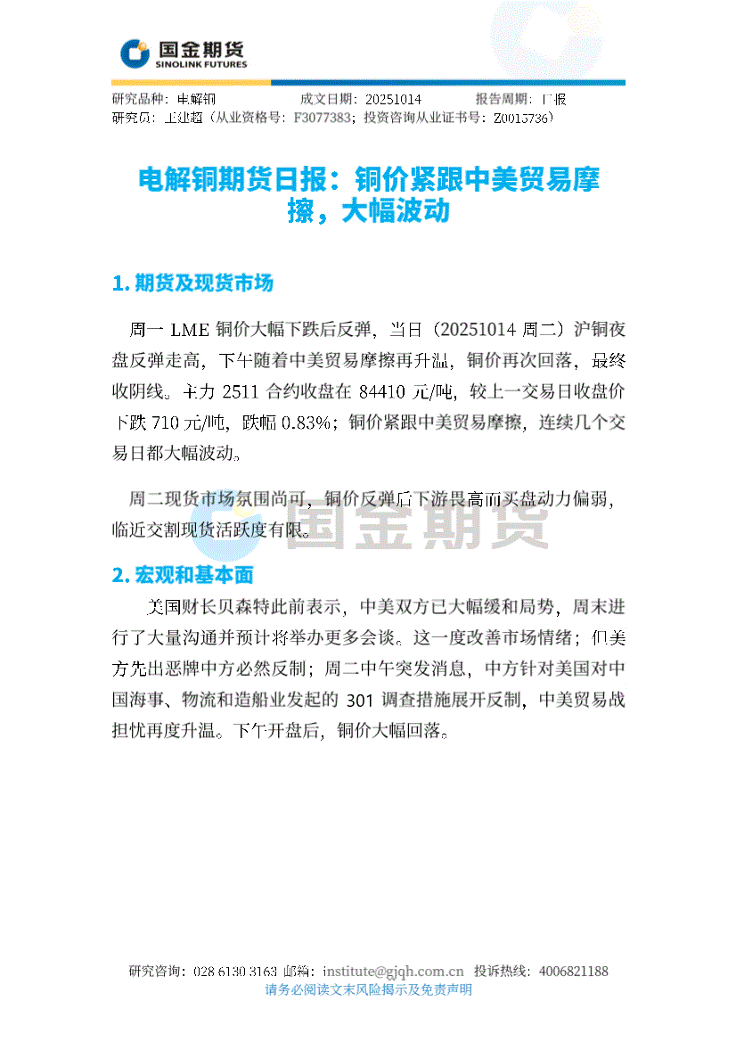 国金期货-电解铜期货日报:铜价紧跟中美贸易摩擦,大幅波动-251014