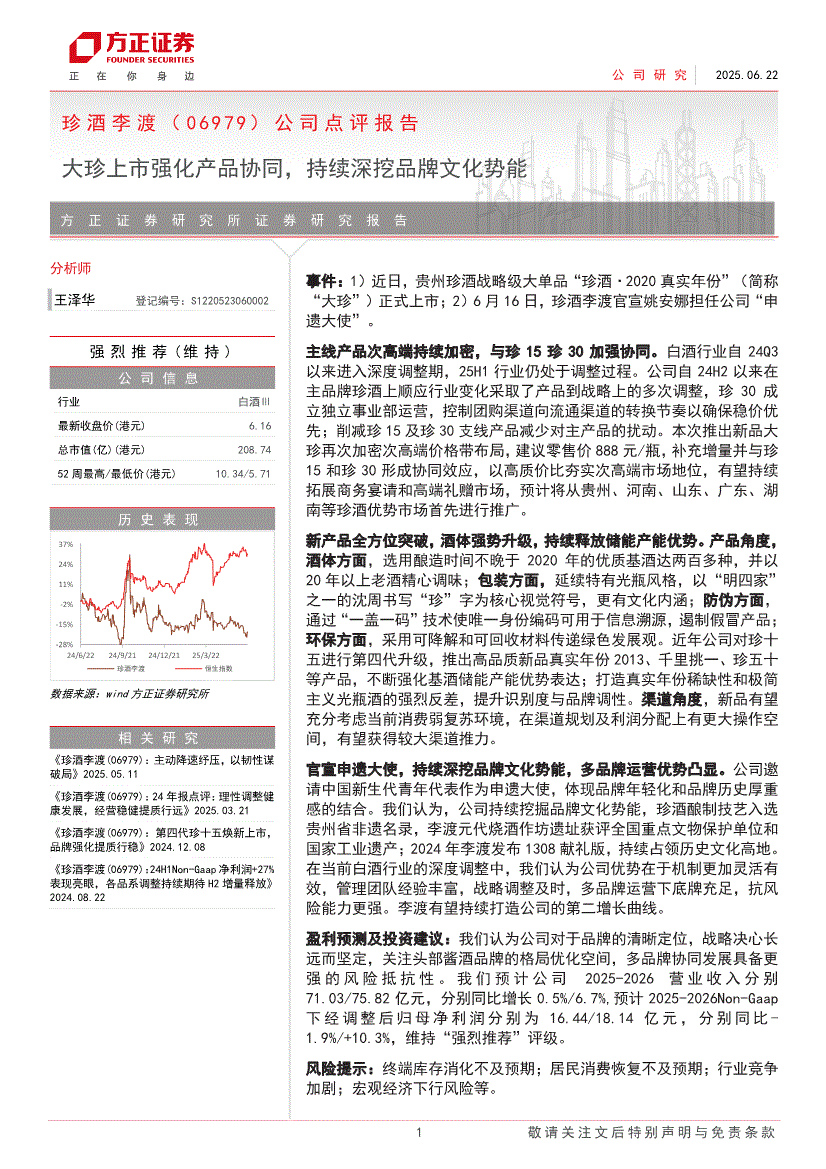 珍酒李渡:方正证券-珍酒李渡-6979.HK-公司点评报告:大珍上市强化产品协同,持续深挖品牌文化势能-250622