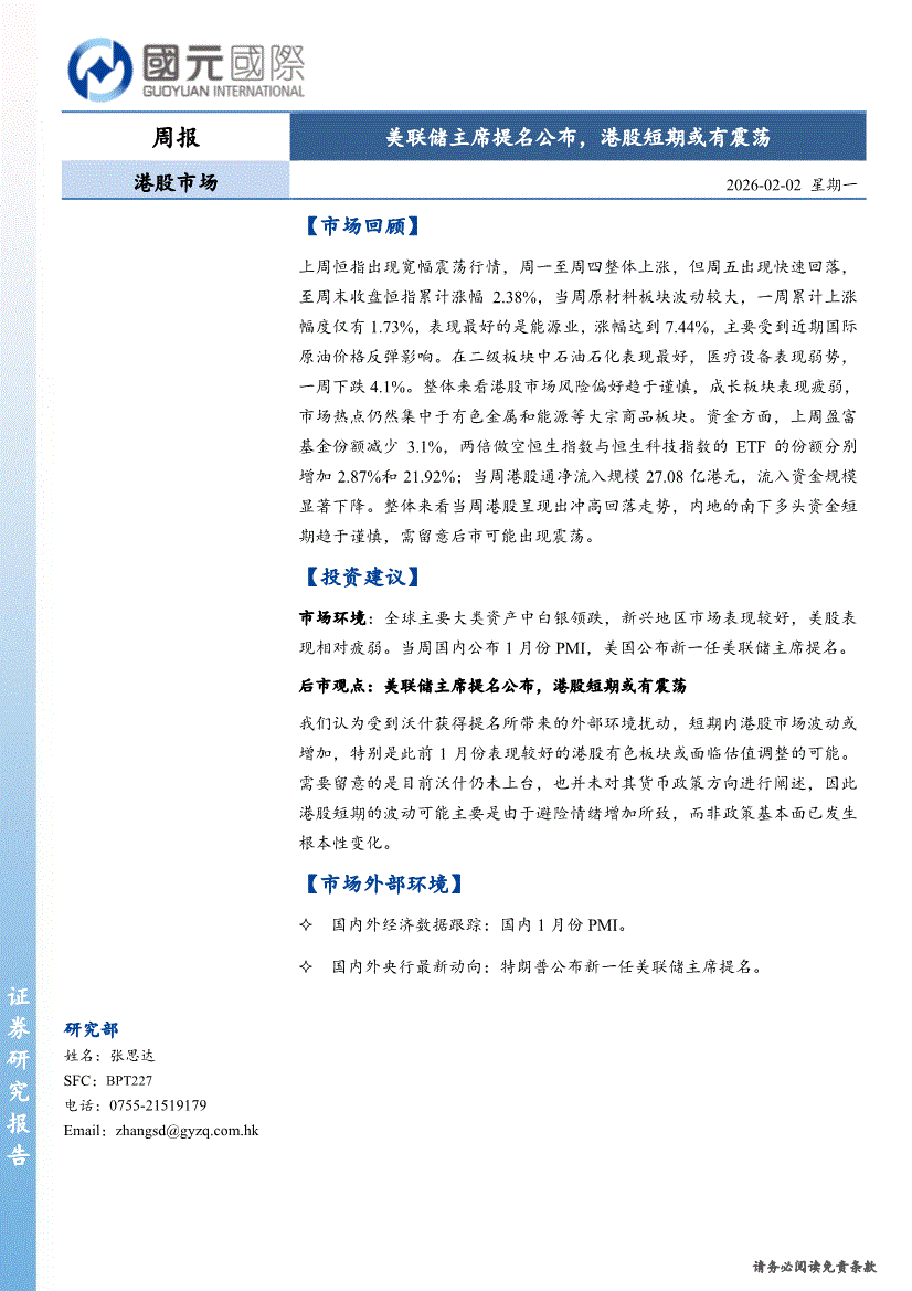国元国际-港股市场周报:美联储主席提名公布,港股短期或有震荡-260202