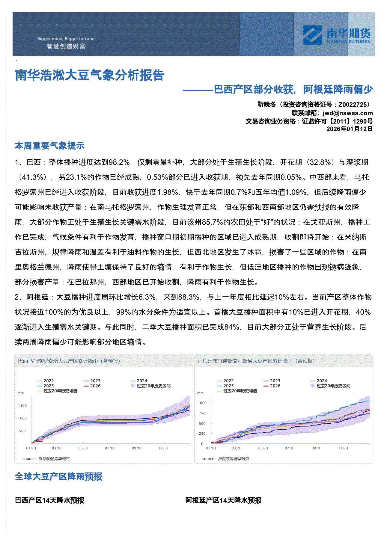 南华期货-浩淞大豆气象分析报告:巴西产区部分收获,阿根廷降雨偏少-260112