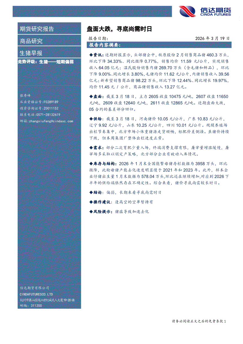 信达期货-生猪早报:暂时止跌,现货寻底尚需时日-260317