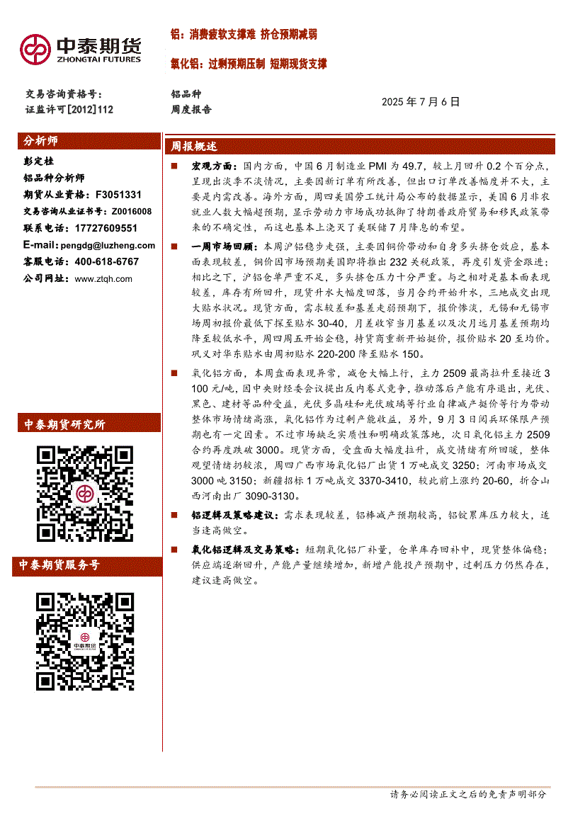 中泰期货-铝品种周度报告:铝,消费疲软支撑难,挤仓预期减弱,氧化铝,过剩预期压制,短期现货支撑-250706
