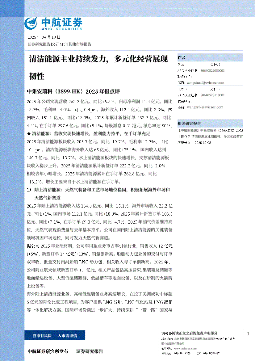 中集安瑞科:中航证券-中集安瑞科-3899.HK-2025年报点评:清洁能源主业持续发力,多元化经营展现韧性-260413