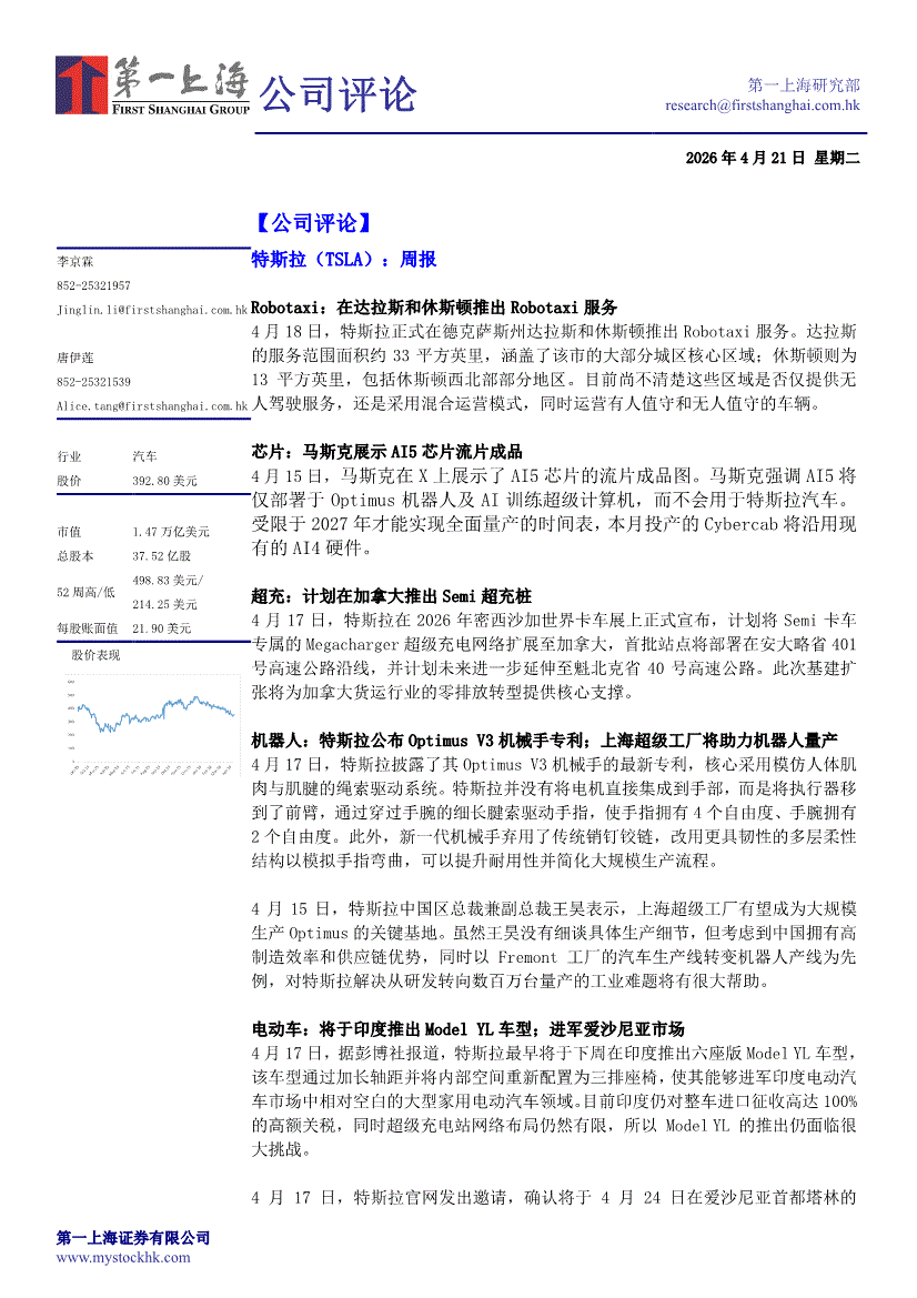 特斯拉:第一上海-特斯拉-TSLA.US-周报-260421