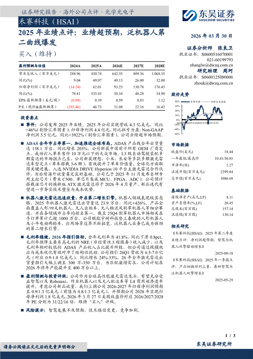 禾赛科技:东吴证券-禾赛科技-HSAI.US-2025年业绩点评:业绩超预期,泛机器人第二曲线爆发-260330