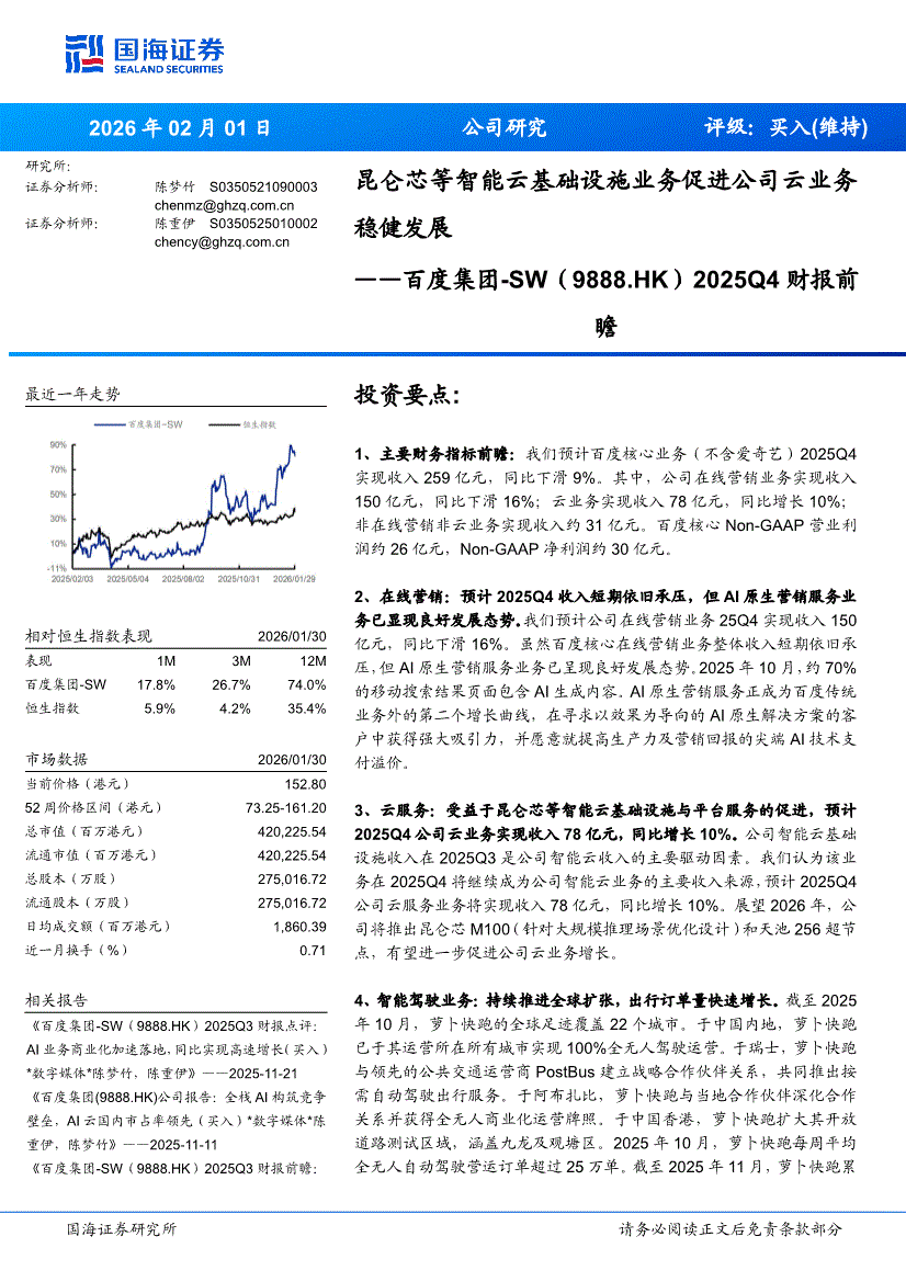 百度集团~SW:国海证券-百度集团~SW-9888.HK-2025Q4财报前瞻:昆仑芯等智能云基础设施业务促进公司云业务稳健发展-260201